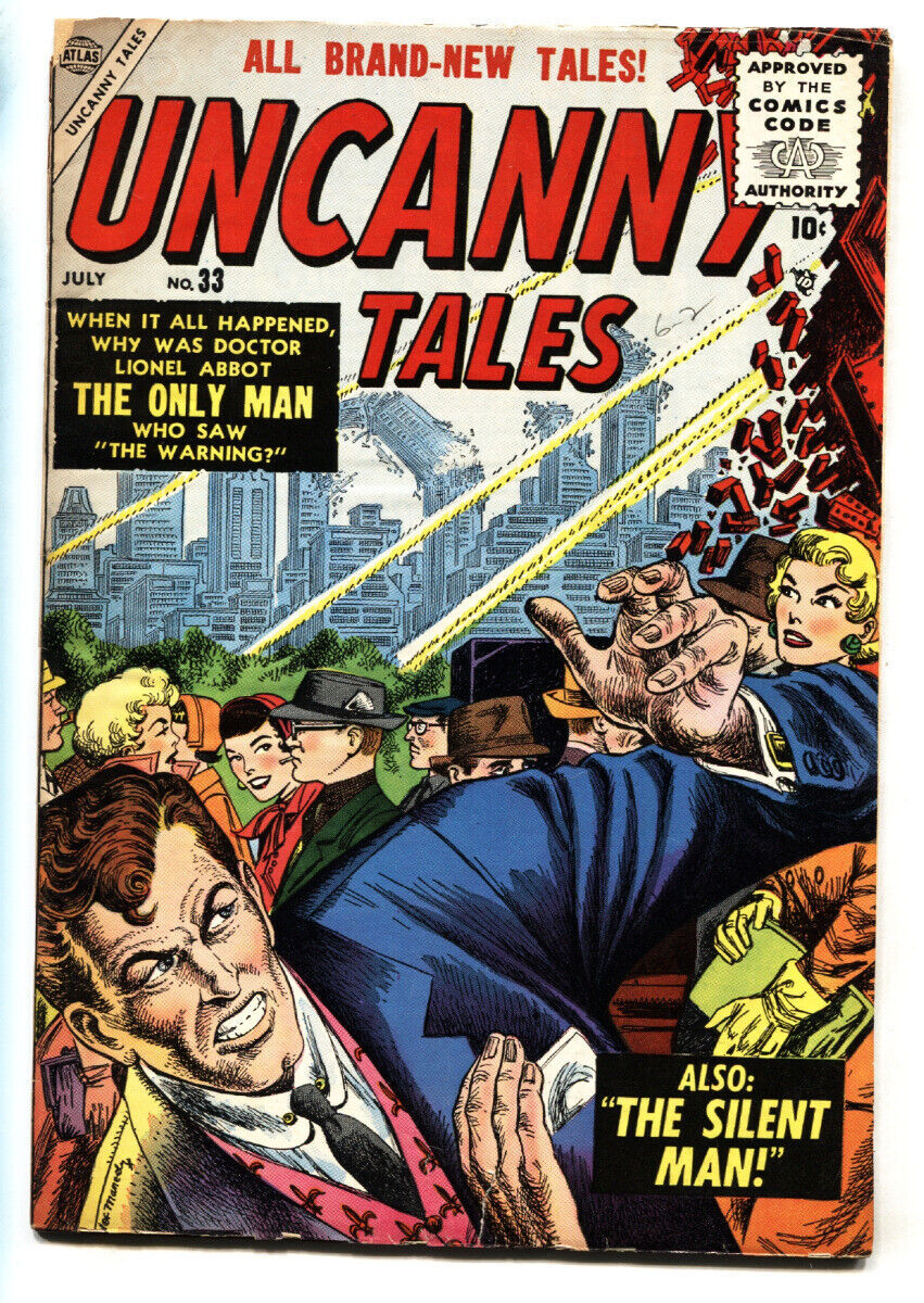 Uncanny Tales Issue: 33 / Year: 1955 Condition: VGClassic ATLAS horror/sci-fi. Joe Maneely cover. Split at top spine. Complete, no restoration. Publisher: AtlasSku: EB-02-199 Sale & Auction Terms and Shipping & Handling Auction Terms & Winning Bidders By purchasing or bidding you agree to all terms of sale stated below. All purchases and winning bids are final. You will receive emails about your win, and package shipping information. Please provide your email address for this purpose. Our feedback system is automated and feedback will automatically be left for the winning bidder after feedback is left for us. Payment Payment is expected within 4 days of auction end. Payment in U.S. funds only. We accept methods other than PayPal. We accept other methods of payment than PayPal, contact us for details. Sales Tax Florida residents add 7.5% sales tax. Shipping & Handling TermsThe shipping and handling fee covers processing your item(s) both in and out of our warehouse, packing materials, consignment costs, and costs of transporting your item(s) to the post office, in addition to the postal fees. We can combine shipping for multiple orders. Large/heavy items cost more than the standard rate to combine. Contact us first if you have any shipping questions. Shipment inside the USA: Buyer pays standard processing and delivery fee as indicated on the invoice. Priority, Express or other services are extra—please let us know and we will revise your invoice. Shipment outside the US: Items listed in the Hip Global Shipping Program will ship at the cost as displayed in the listing. This amount cannot be adjusted. For insurance reasons we must declare the actual value for the item(s) on all customs form, we will not declare a lower value on customs forms, by purchasing this item you are agreeing to this. ReturnsWe accept returns within 14 days except for any professionally graded comic book. This includes CGC, PGX and CBCS graded comic books. Please be aware these items are NON RETURNABLE. No exceptions. Over 100,000 mail orders processed! Bid with confidence. I can sell items for you! Track Page Views WithAuctiva's FREE Counter