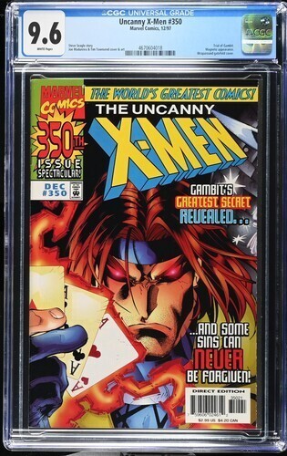 Grade: 9.6 Near Mint+Uncanny X-Men #350 CGC 9.6.You will receive exactly what is pictured in the listing. Items will be shipped extremely carefully to insure they arrive in excellent condition.All S/H for this auction varies. I do combine items for shipping. Insurance is included with all shipping. For International buyers please note any custom fees charged by your country are your responsibility. I will always try to accommodate any special requests.If there are ever any problems regarding your purchase please contact me prior to putting in claims, leaving negative feedback, or giving out low ratings. I aim for 5 out of 5 stars all the time and will always do my best to fix any issues. I always make sure my customers are happy!!!!I ship fast and secure, just check my feedback. Please feel free to E-mail me with any questions or if you need larger scans. Please check out my other auctions!! Happy Bidding. Good Luck.
