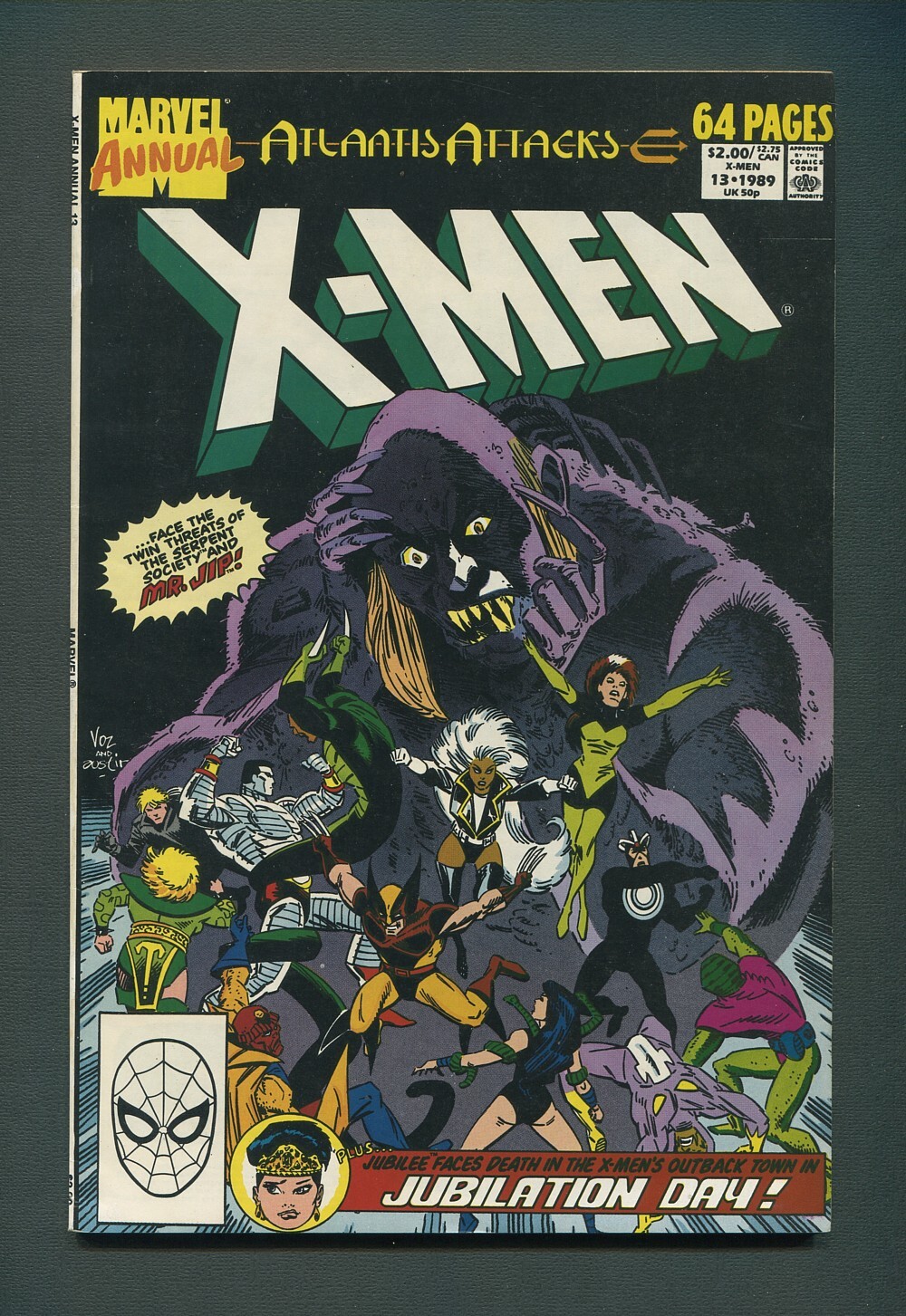 Atlantis Attacks tie-in "Double Cross" Script by Terry Austin, art by Mike Vosburg. Story continued in Amazing Spider-Man Annual 23. "Jubilation Day" Jubilee back-up story. Script by Sally Pashkow, pencils by Jim Fern, inks by Joe Rubinstein. Saga of the Serpent Crown chapter 3, "Serpent in the Garden" Script by Peter Sanderson, pencils by Mark Bagley, inks by Keith Williams. Cameo by Robert E. Howard's King Kull. Story continued in Amazing Spider-Man Annual 23 (not 24, as listed). Vosburg/Austin (PC 8)