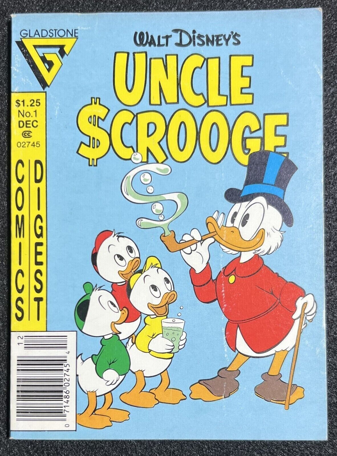 Grade: 9.2 Near Mint-Item Information: Uncle Scrooge Comics Digest #1 Gladstone 1986 EB235Issue 1. December 1986. Digest size. Reprints of classic Disney comics. 5" x 6.5". 96 pages. Full color. Cover price $1.25.*Please note we put a generic grade of 9.2 VF/NM on all of our listings of comics but most are in better condition with very few being worse.**We use the Stock Photo provided by the publisher, due to listing the items before release date. A few times the publisher will make small changes to the image before shipping them, including but not limited to adding trade dress, changing colors of the title, etc. We try and replace the image but do not always see the change. Please be aware.*Terms: We are happy to combine shipping on domestic shipments. If you purchase more than one item, and the following rate does not properly apply, please request a combined shipping invoice before making payment:First book is $4.99, each additional book adds $1.00 We DO NOT ship media mail for comics, because those shipments are legally not supposed to contain advertising and are subject to inspection. Media mail shipments also take longer to arrive, so with our First Class or Priority Mail shipment you will get your books in a timely manner and you can trust our integrity in following legal guidelines. We also take special care to package items securely, unlike others who are more concerned with expediency (and skirting shipping rules).If you are and international bidder:We use Hip's international shipping program. Information about this program and to see if you country qualifies check here: