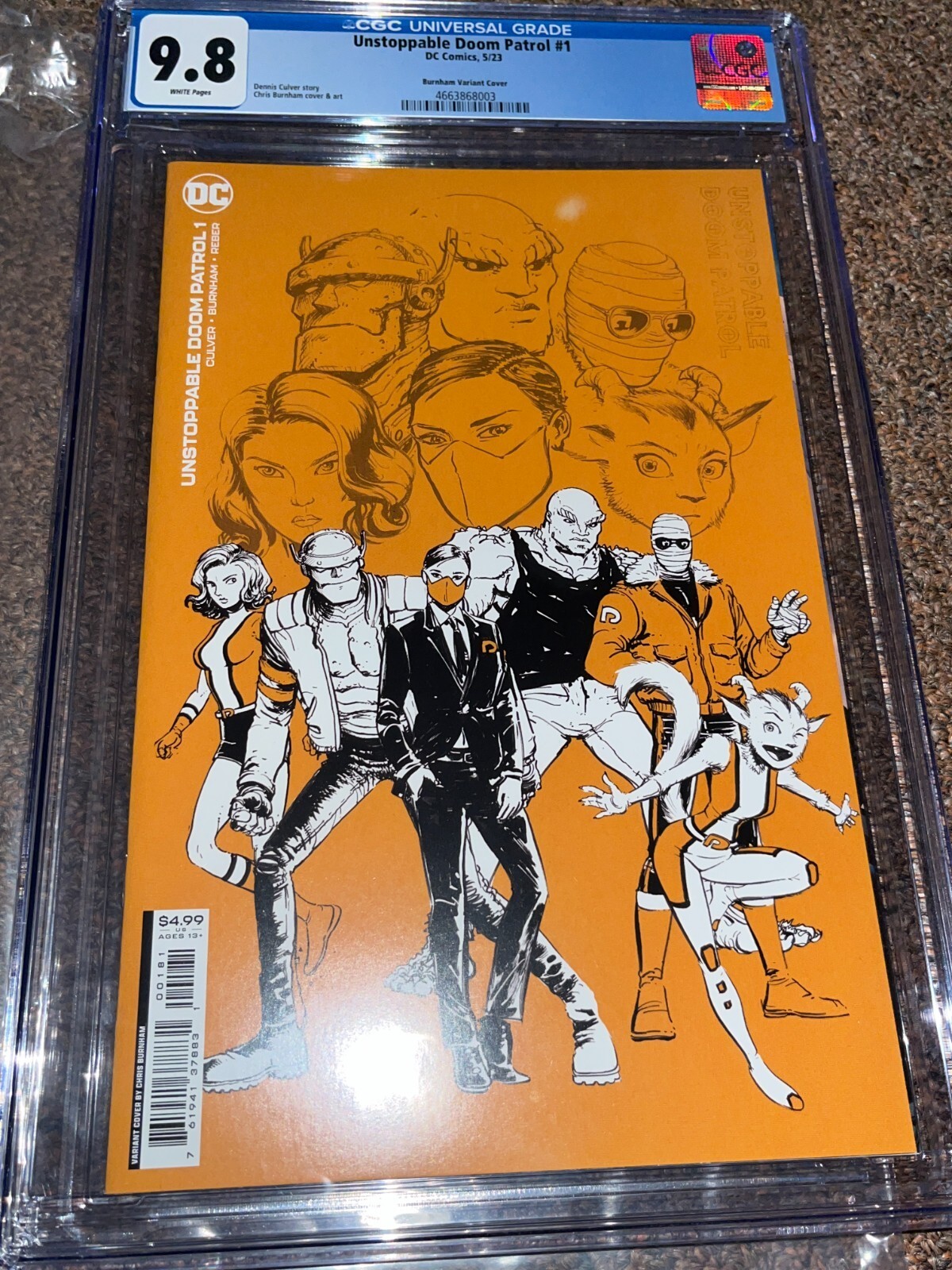 Grade: 9.8 Near Mint/MintUp for sale is a Unstoppable Doom Patrol 1 (2023). This is the Burnham C variant cover. The book has been graded by CGC at 9.8. The case is in great condition with no issues.________________________________________________________________________________________________________________________________SELLER TERMS AND CONDITIONS:Please take a look at my other items as I do combine shipping on all orders.If you purchase multiple items, please wait for an updated shipping invoice before paying.Items are from a smoke free environment.Payment is due within 3 days. Please contact me with any questions.