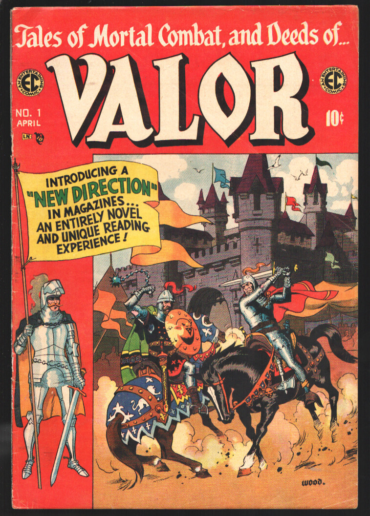 Grade: VG+Valor #1-1954-EC-1st issue-Tales of Mortal Combat-Wally Wood-Story art by Williamson-Graham Ingles-Angelo Torres-VG+ -First issue -Tales of Mortal Combat -Cover by Wally Wood -Story art by Williamson, Graham Ingles, Angelo Torres, Bernie Krigstein & Wood -Glossy & colorful cover-spine split from top down to top staple Grade: VG+ SKU: EC-14-076