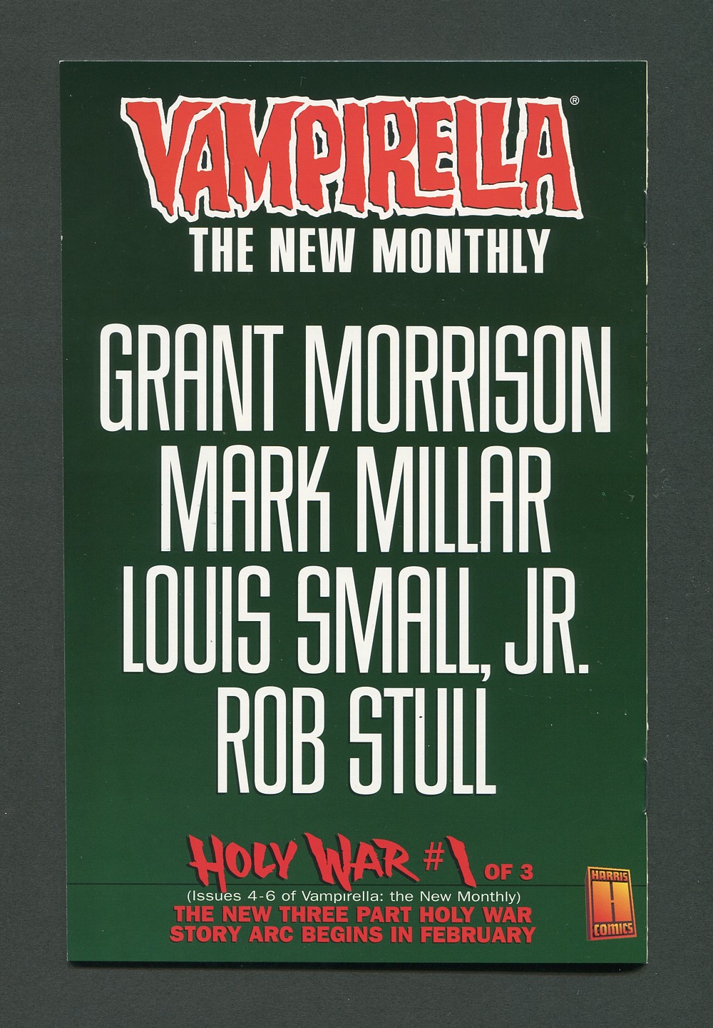 Written by Grant Morrison with Mark Millar, art by Amanda Connor. 1998 Vampirella Holy War Limited Ash Can Edition full-color card stock cover with black-and-white interior, 5-1/2-in. x 8-1/2-in.