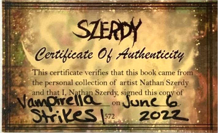 VAMPIRELLA STRIKES #1 NATHAN SZERDY VIRGIN VARIANT SIGNED/REMARKED W/COA NM.
