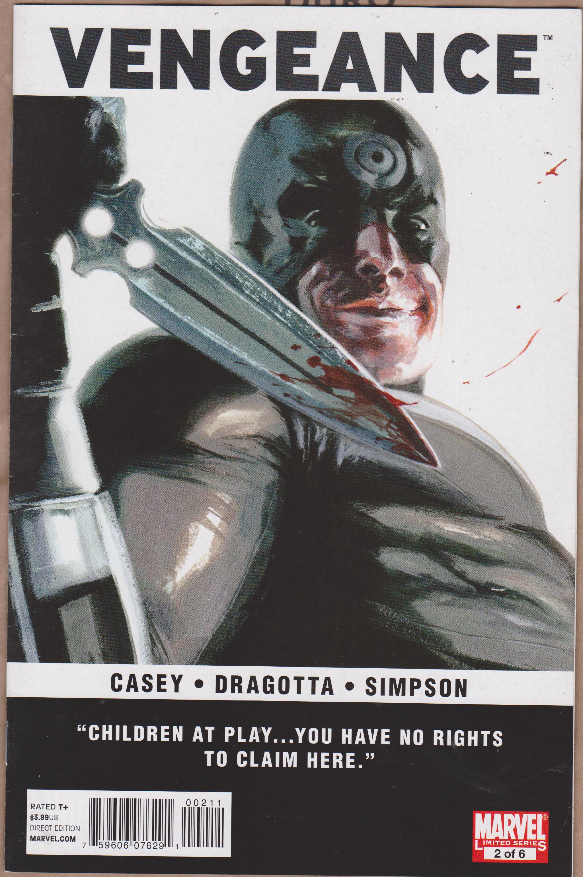 Vengeance #2 by Marvel Comics copyright 2011. I have graded the comic book, using the Overstreet Grading Guide, at FINE/VERY FINE with the following defects: Couple of light defects along the spine. Corners are rounded. There is some light yellowing of the pages.Follow me on twitter @denofwonder for update