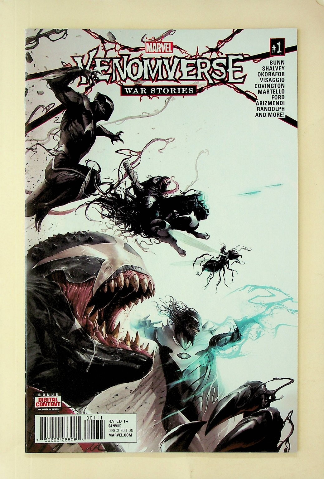 Grade: 9.2 Near Mint-...This is a single issue of Venomverse War Stories #1 published by Marvel Comics. This comic is a key part of the Venomverse event, featuring multiple symbiote characters and intense action. The cover features dynamic artwork showcasing various Venomized figures, making it a compelling collectible for fans of Marvel and the Venom universe. This issue includes contributions from a roster of talent including BUNN, SHALVEY, OKAFOR, VISAGGIO, COVENTON, MARTELL, LORD, ALZAMENDI, and RANDOLPH, offering a collection of "War Stories" within the Venomverse narrative.This listing includes one (1) comic book as shown in the images. It is a standard edition comic book, priced at $4.99 US, and rated T+. This modern age comic is a great addition for collectors seeking Marvel comic books, especially those interested in Venom, symbiotes, or crossover events. The vibrant cover art makes it a standout piece for display, appealing to both seasoned collectors and new fans of graphic novels and superhero stories.