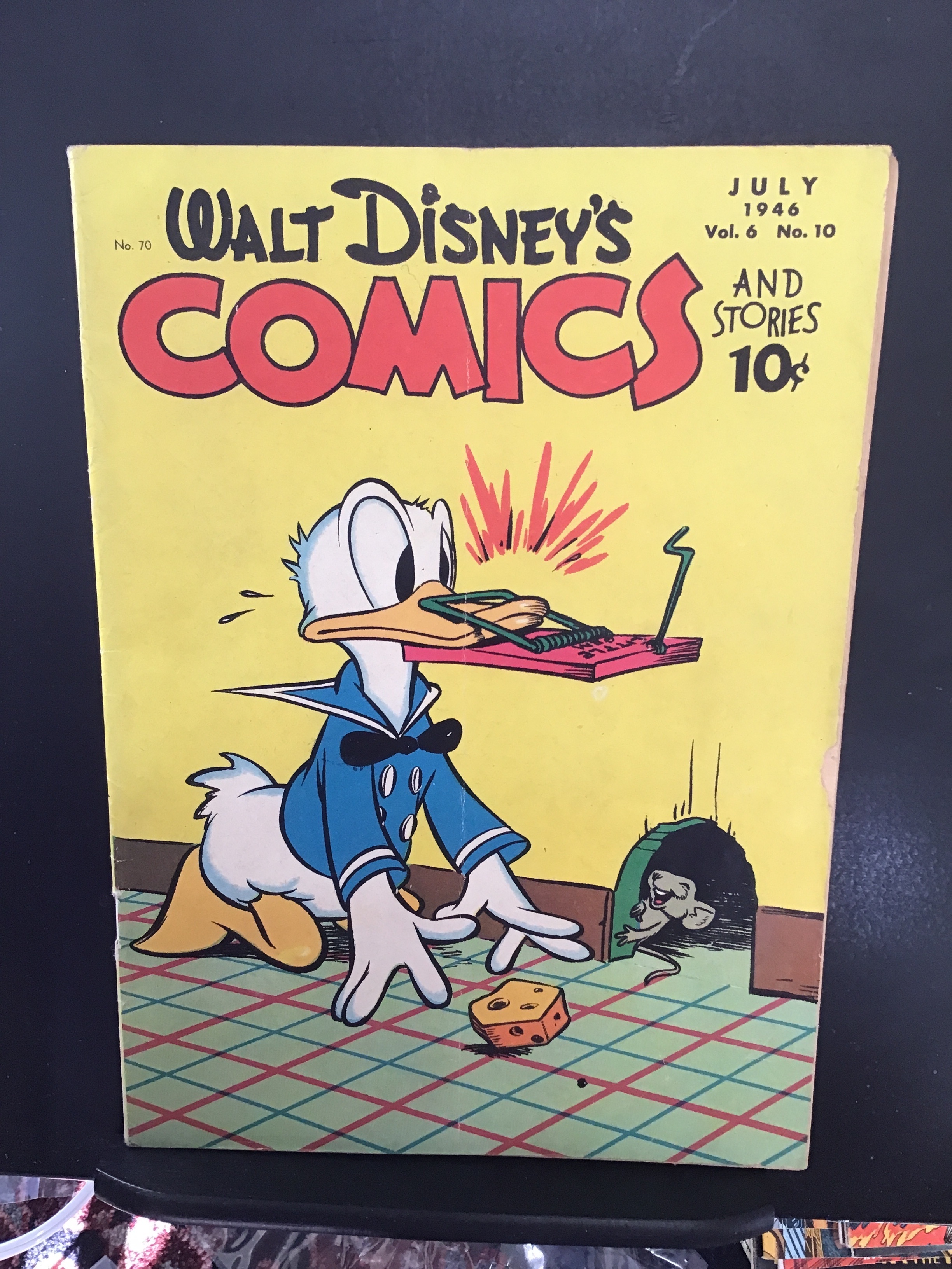 Walt Disney's Comics & Stories #70 (1946) Wow this book has a deep rich red cover with very nice eye-appeal. With very small chip with the outer edge of the front cover and a very tiny one of the outer edge of the back cover. With cream/very slight cream tint interiors. We have adjusted the grade accordingly. There is a shipping label stamp on the back cover which does not affect the grade. With where appropriate grade.Seller Information