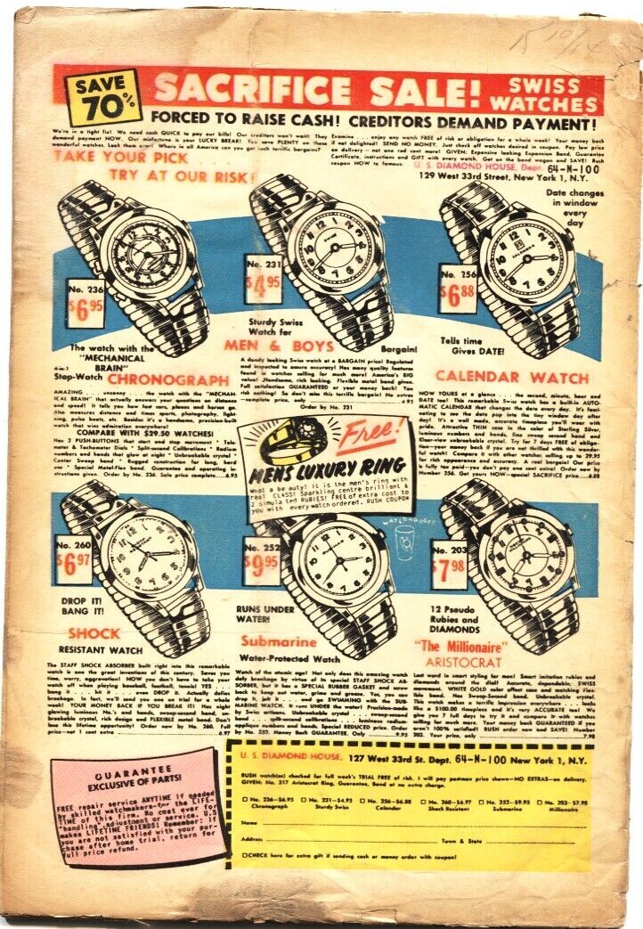 Wanted Issue: 51 / Year: 1952 Condition: FRHoliday of Horror - Dope Addict - drug use story. Syd Shores art - Jailbreak story. Violent crime & pre-code terror. Part of cover missing. Contents still nice, readable and collectible. Low grade. Rare Publisher: OrbitSku: DO-54-136 Over 100,000 mail orders processed! Buy with confidence.