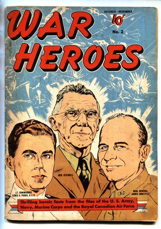 War Heroes #2--comic book 1942- General Stilwell and Jimmy Doolittle -WWII issue, Flying Tigers. -Generals Stilwell and Jimmy Doolittle cover and story. -Corregidor. -1st bombing of Japan. -Cover loose from book. TI ... Read More