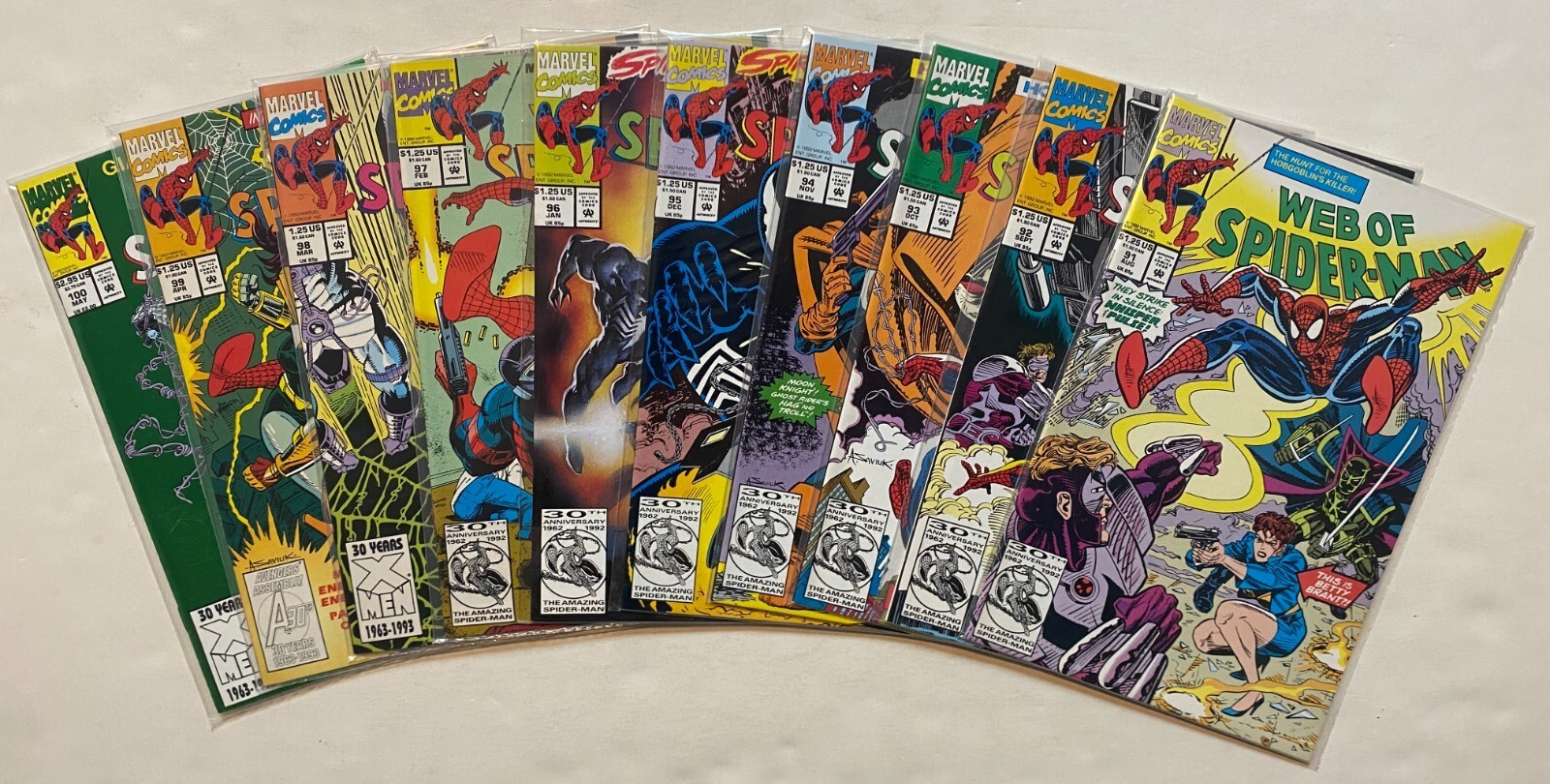 Condition: All books near mint unless noted. From an original owner collection.Web of Spider-Man (1985) 81-100 | 20 High Grade Books. From an original owner collection.All books graded by Frank, and backed by our no-questions-asked money back guarantee.We encourage you to browse our store. If you buy multiple items, there's a good chance you'll save a substantial amount on shipping by combining multiple orders into one box. Friendly Frank's was started in 1978 with a $40 investment. We started Friendly Frank's Distribution in 1982, the regional distributors Co-Op Jam in 1983, the Comic Book Legal Defense Fund in 1986, and B-Bop Comics in Kansas City in 1999. A member of the 100 Million Sold Club. Largest buyer and seller of old comics in Kansas and Missouri. Thank you!