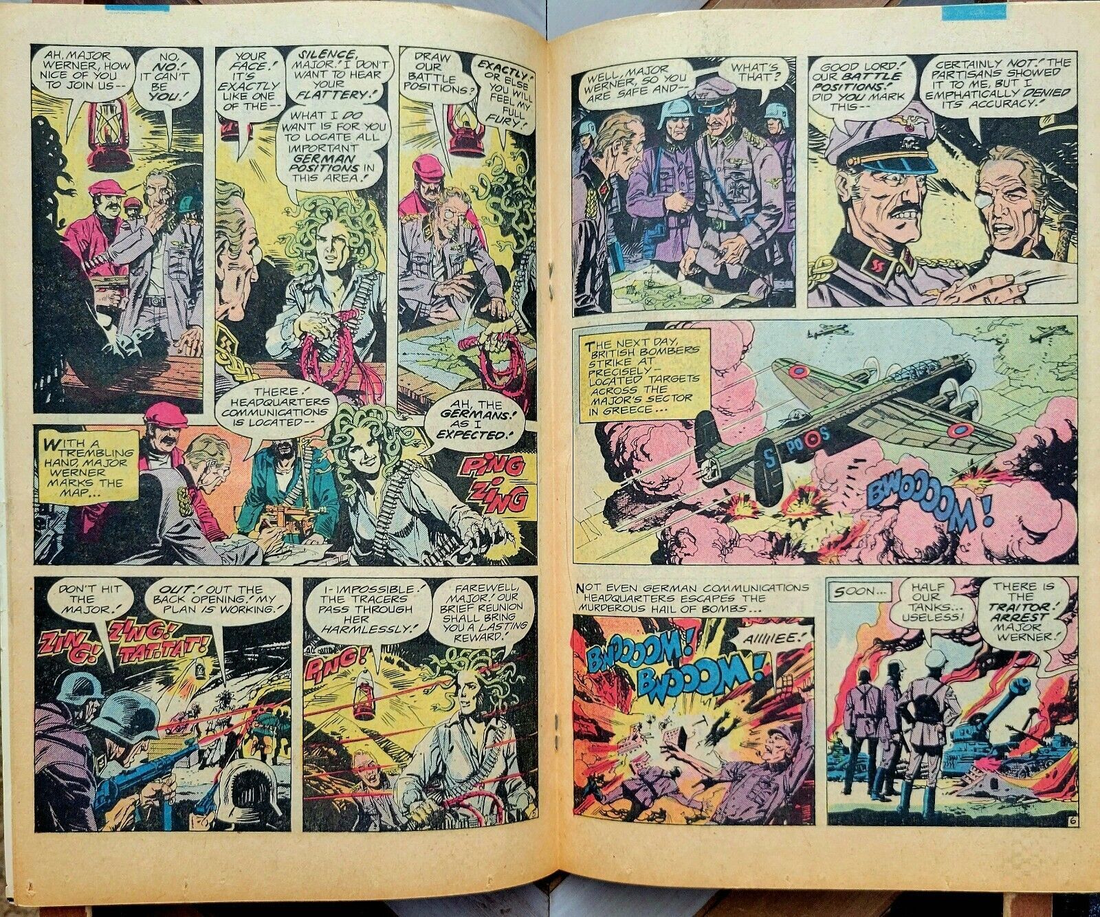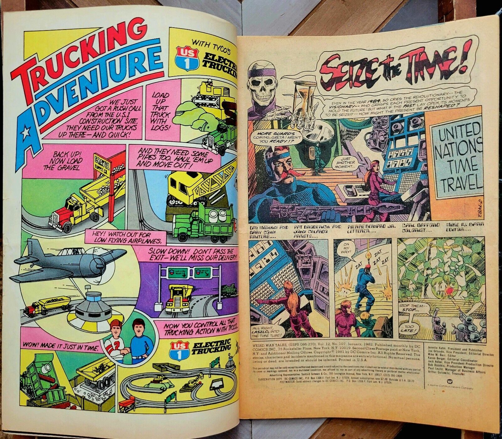 WEIRD WAR TALES #107 VG DC 1982 WWII Kubert Cover HORROR + Todd McFarlane Letter HORROR WWII, Dinosaurs and more! Cover art by Joe Kubert. Seize the Time!, script by Dan Mishkin and Gary Cohn, pencils by Pat Broderick, inks by John Celardo; set in the year 1989. The Monster Marines humor page by Dave Manak. Last Chance!, script by Mike W. Barr, art by Dan Spiegle; set sometime in the near future. The Avenging Ones, script by Paul S. Newman, art by Fred Carrillo; set in Greece during World War II. The Turnabout Battle, script by Robin Snyder, art by Angel Trinidad Jr.; set in Rosenburg, Oregon on 4 July 1885 during a re-enactment of the Battle of Rappahannock during the Civil War in December 1862. A letter from Todd McFarlane. 36 pgs, full color. Solid VG. Book is complete and still lays flat with bright colors and excellent eye appeal. Please review the photos for the exact comic you will receive. Please send me any questions you may have. All grades are approximate please review the photos to verify condition. Ships fast, First Class Please feel free to ask questions, see my feedback & buy with confidence.Seller Information