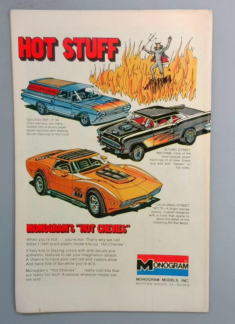 This issue also includes a "Hot Stuff" advertisement section showcasing Monogram Models' "Hot Chevies" - a nostalgic glimpse into 1970s toy model kit marketing featuring classic American muscle cars including the Quicksilver, '55 Chevy Street Machine, and California Street Vette with detailed custom hood designs.