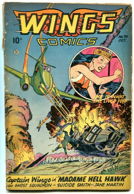 Wings Issue: 74 / Year: 1946 Condition: GSpicy good girl art panels in this issue. Phantom Falcon - masked hero. Tape repairs. Publisher: Fiction HouseSku: DO-07-267 Over 100,000 mail orders processed! Buy with confidence.