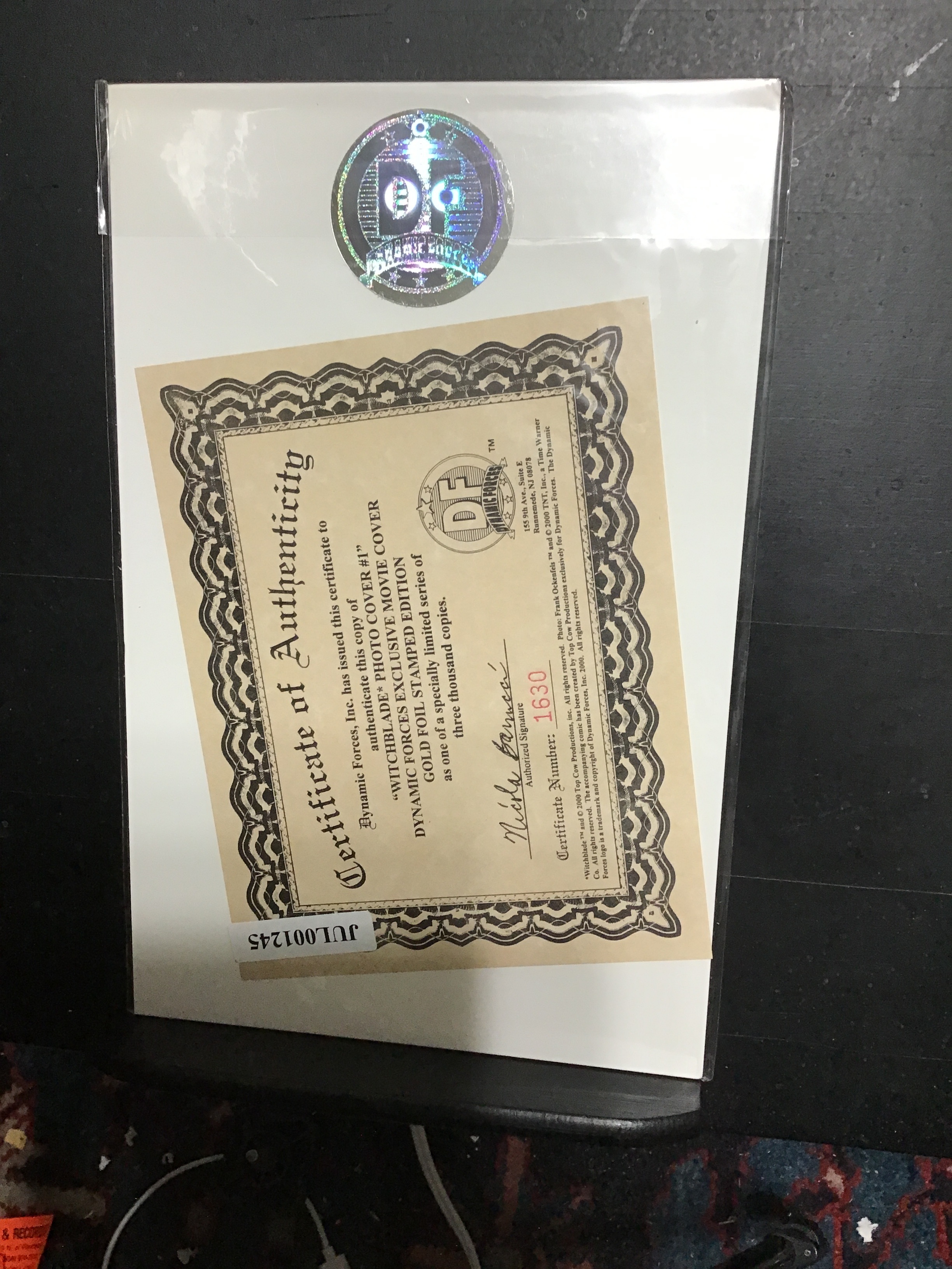 Witchblade: Movie Edition Dynamic Forces Variant (2000) This book has deep rich color and nice eye-appeal on this all-time classic Angelina Jolie Photo cover gold foil key cover! The book is well attached at the spine and the centerfold with white pages and inside covers. We have adjusted the grade accordingly. With light wear appropriate to grade. This book comes with a certificate of authenticity from dynamic forces!Seller Information