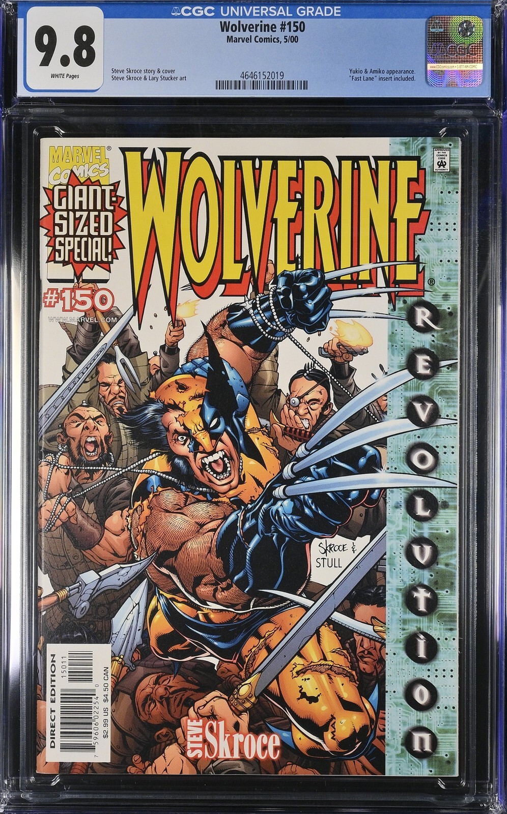 Wolverine #150 from 5/00 offers a glimpse into the era's iconic storytelling. Featuring yukio & amiko appearance., "fast lane" insert included., this issue is a must-have for collectors. Add this CGC 9.8 graded comic to your collection today!Attribute DetailsCertNumber 4646152019DisplayGrade 9.8GradeCategory ModernPageQuality WHITEArtComments Steve Skroce story & cover, Steve Skroce & Lary Stucker artKeyComments Yukio & Amiko appearance., "Fast Lane" insert included.CollectibleID 25166CollectibleType CTitle WolverineIssue 150IssueDate 5/00Publisher Marvel ComicsYear 2000PopulationAtGrade 65population_7_0 1population_9_0 2population_9_4 6population_9_6 16population_9_8 65Sales History