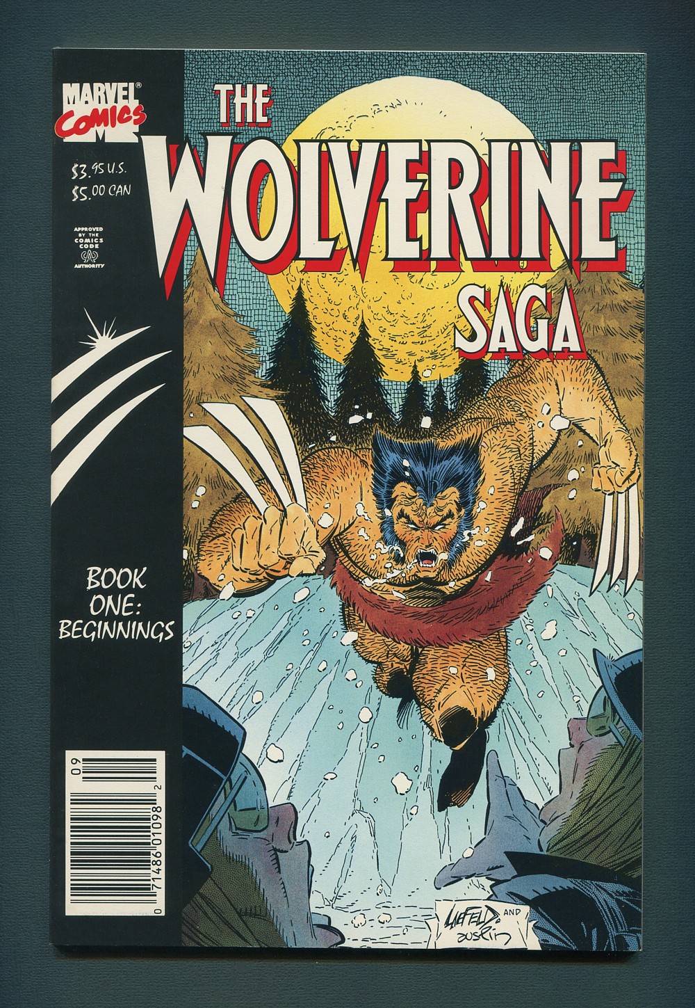 Cover pencils by Rob Liefeld, inks by Terry Austin. "Book One," written by Peter Sanderson, based upon material written by John Byrne, Chris Claremont, Peter David, Bill Mantlo and Len Wein. Based upon Alpha Flight #17 & #33, Classic X-Men #1-10, Giant Size X-Men #1, Incredible Hulk #181-182, Wolverine #9-10 and X-Men #94-101. Art from Jack Abel, Terry Austin, John Bolton, John Buscema, Sal Buscema, John Byrne, Frank Chiaramonte, Dave Cockrum, Gene Colan, Vince Colletta, Sam Grainger, Klaus Janson, William Johnson, Jack Kirby, Mike Mignola, Al Milgrom, Frank Miller, Paul Neary, Bill Sienkiewicz, Chic Stone, Gerry Talaoc, and Herb Trimpe; Narrative history with reprint clip art of Wolverine from the X-Men's team up with Spider-Man through the death of Dark Phoenix. Back cover art by Andy Kubert. In "Marvel Saga" format. 52 pgs., full color.