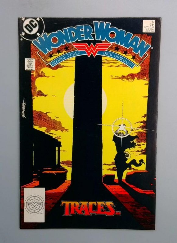 Wonder Woman #17 features a dramatic, moody cover exploring themes of tracking and pursuit, with a silhouetted figure in a targeting reticle against a stark yellow and black background. The issue is part of the George Perez and Dick Giordano run, with "Traces" prominently displayed, suggesting a story focused on investigation or following a trail. The Wonder Woman logo and DC Comics branding are prominently featured, indicating this is a key issue in the character's mythology during this creative era.