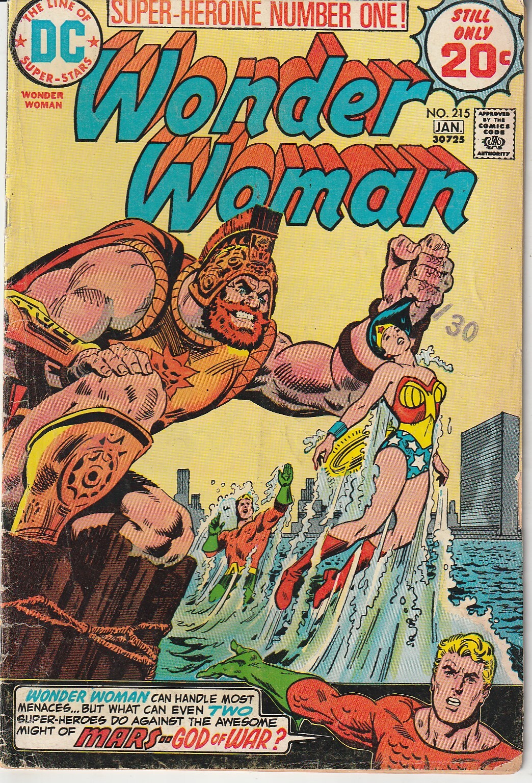 Wonder Woman vs Mars, God of War as Aquaman looks on ! Story by Signature Superman writer Cary Bates. Cover art by Signature Superman artist Curt Swan ?
