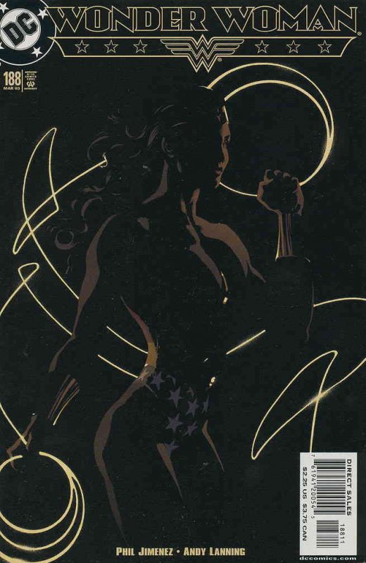 Item: Wonder Woman (2nd Series) #188 | Publisher: DC | Cover Date: March 2003 | Writer: Phil Jimenez | Artist: Phil Jimenez | Cover Artist: Adam Hughes | Appearances: Darkseid, Granny Goodness, Donna Troy, Wildcat | Storylines: Wonder Boys | With Economy shipping, each additional comic ships for just 50 cents more to customers in the USA. This listing contains a stock photo and information from ComicBase™ and © Human Computing. The stock photo is for reference only. If you would like to see a photo of the actual item, please message us prior to purchasing.Seller Information