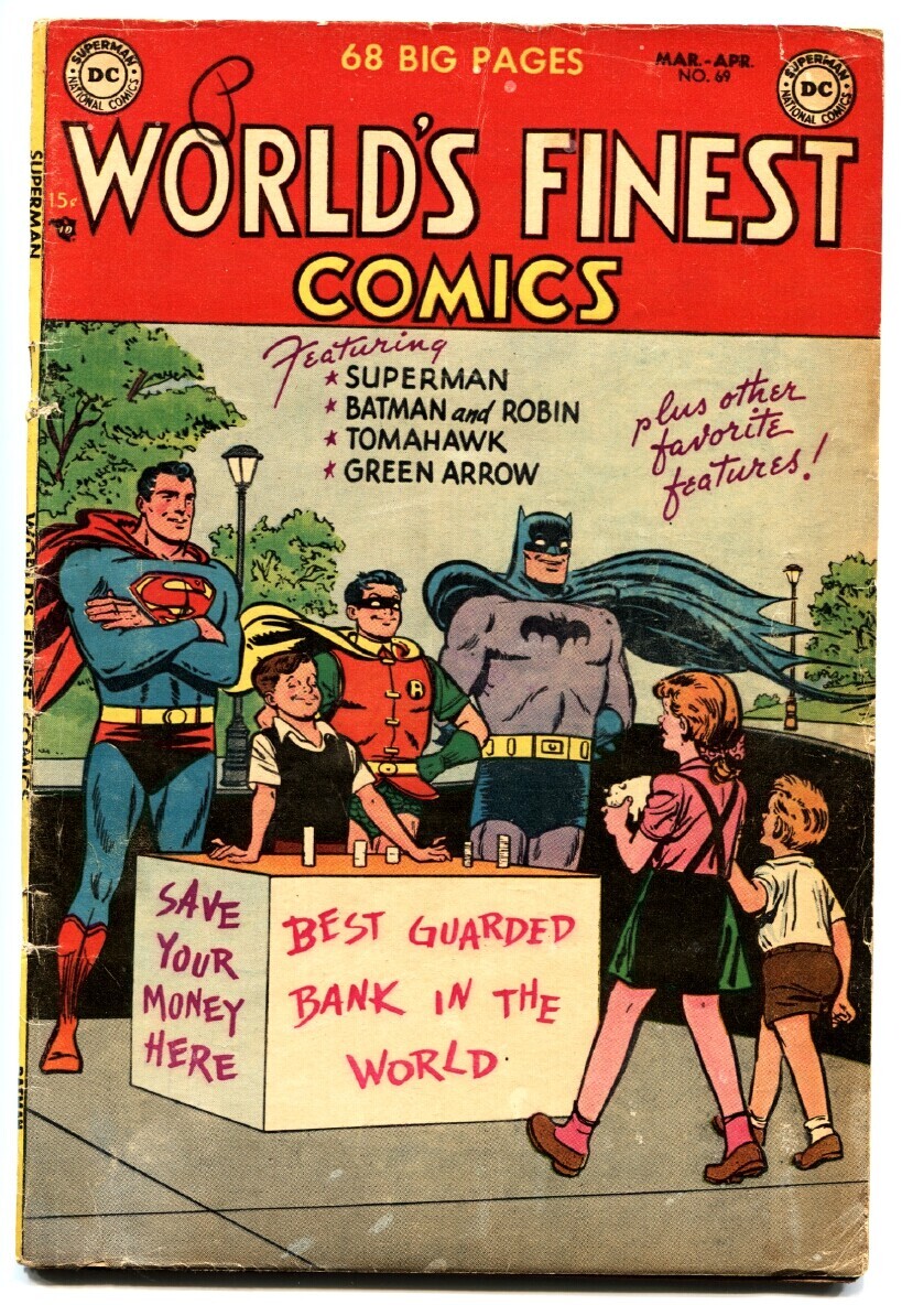 Grade: VGWorld's Finest #69-1954-Batman Superman Green Arrow Tomahawk DC golden age -Superman, Batman, Green Arrow, Tomahawk. -Jor-El's last will! -Scarce 15 cent issue. -Glossy cover, tears around staples which both are still attached to the book. Grade: VG SKU: DHV-06-102