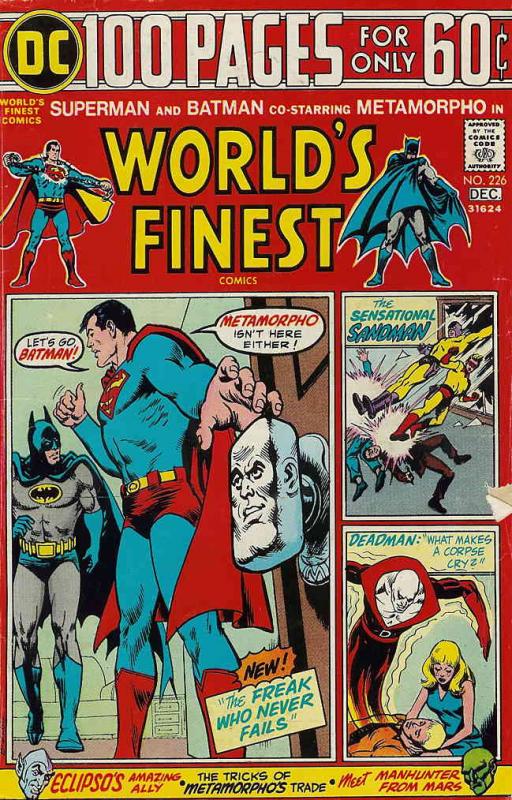Item: World's Finest Comics #226 | Publisher: DC | Cover Date: December 1974 | Writer: Bob Haney, Joe Simon, Bob Rozakis | Artist: Dick Dillin, Jack Kirby, Alex Toth, Neal Adams, Joe Certa | Cover Artist: Nick Cardy | Appearances: Metamorpho (Rex Mason), Superman (Clark Kent/Kal-El), Batman (Bruce Wayne), Simon Stagg, Sapphire Stagg, Sandman (Wesley Dodd), Sandy (Sanderson Hawkins), Eclipso (Bruce Gordon), Robotman (Paul Dennis), Deadman (Boston Brand), Martian Manhunter (J’onn J’onzz) | Storylines: The Freak Who Never Fails; The Tricks of Metamorpho’s Trade; I Hate The Sandman; Eclipso’s Amazing Ally; Robotman: The Crime Collector; Deadman: What Makes A Corpse Cry; Martian Manhunter: The Strange Experiment of Dr. Erdel; Martian Manhunter: The Case of the Magic Baseball | Notes: Reprints from Adventure Comics #87, House of Secrets #63, Detective Comics #194, 225-226, Strange Adventures #207 | With Economy shipping, each additional comic ships for just 50 cents more to customers in the USA. This listing contains a stock photo and information from ComicBase™ and © Human Computing. The stock photo is for reference only. If you would like to see a photo of the actual item, please message us prior to purchasing.Seller Information