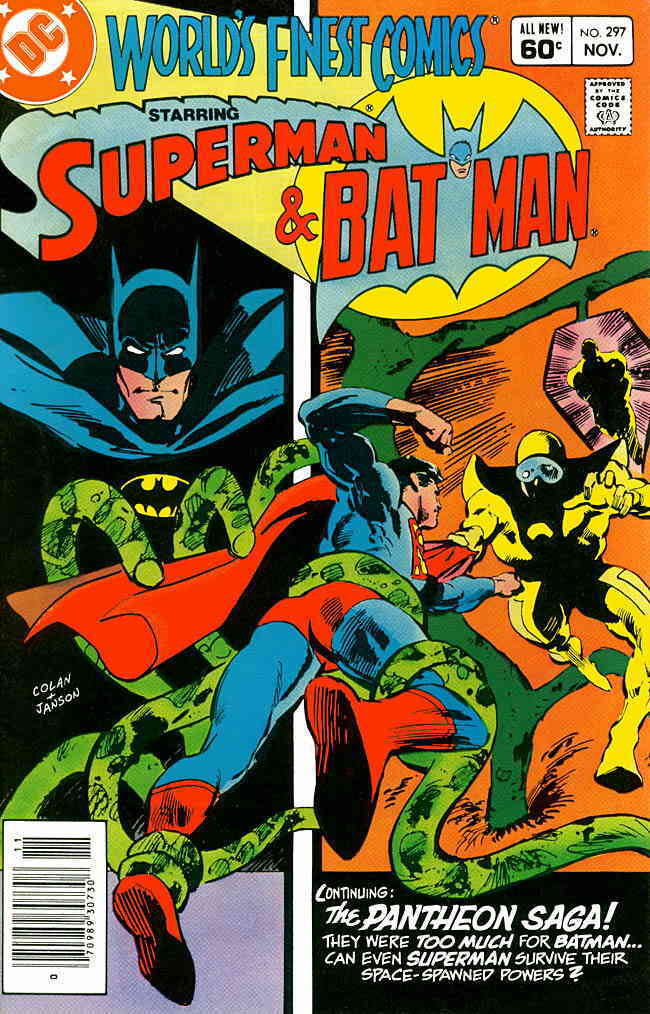 Item: World's Finest Comics #297 (Newsstand) | Publisher: DC | Cover Date: November 1983 | Writer: David Anthony Kraft, Ron Fontes | Artist: Gene Colan | Cover Artist: Gene Colan | Appearances: Superman (Clark Kent/Kal-El), Batman (Bruce Wayne), the Pantheon | Storylines: The Pantheon, Part 2; The Cosmic Tree! | Notes: Versus the Pantheon; newsstand edition | With Economy shipping, each additional comic ships for just 50 cents more to customers in the USA. This listing contains a stock photo and information from ComicBase™ and © Human Computing. The stock photo is for reference only. If you would like to see a photo of the actual item, please message us prior to purchasing.Seller Information