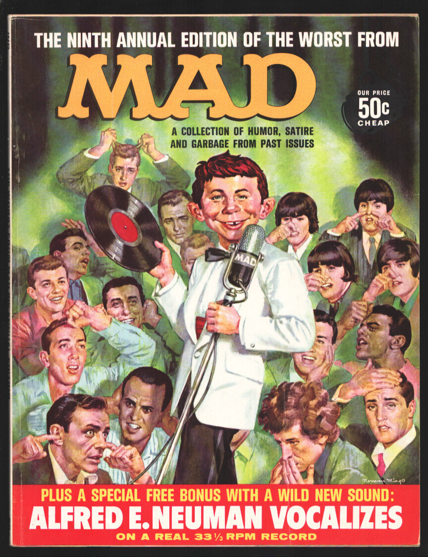 Grade: FN- Worst From Mad Annual #9-1966-Norman Mingo cover-Alfred E. Neuman with The Beatles-Sinatra-Elvis-bonus record-FN- -Norman Mingo cover art features Alfred E. Neuman with The Beatles-Sinatra-Elvis-Bob Dyla ... Read More