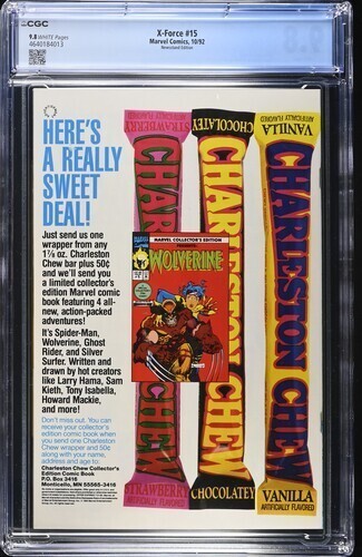 Grade: 9.8 Near Mint/MintX-Force #15 CGC 9.8.You will receive exactly what is pictured in the listing. Items will be shipped extremely carefully to insure they arrive in excellent condition.All S/H for this auction varies. I do combine items for shipping. Insurance is included with all shipping. For International buyers please note any custom fees charged by your country are your responsibility. I will always try to accommodate any special requests.If there are ever any problems regarding your purchase please contact me prior to putting in claims, leaving negative feedback, or giving out low ratings. I aim for 5 out of 5 stars all the time and will always do my best to fix any issues. I always make sure my customers are happy!!!!I ship fast and secure, just check my feedback. Please feel free to E-mail me with any questions or if you need larger scans. Please check out my other auctions!! Happy Bidding. Good Luck.