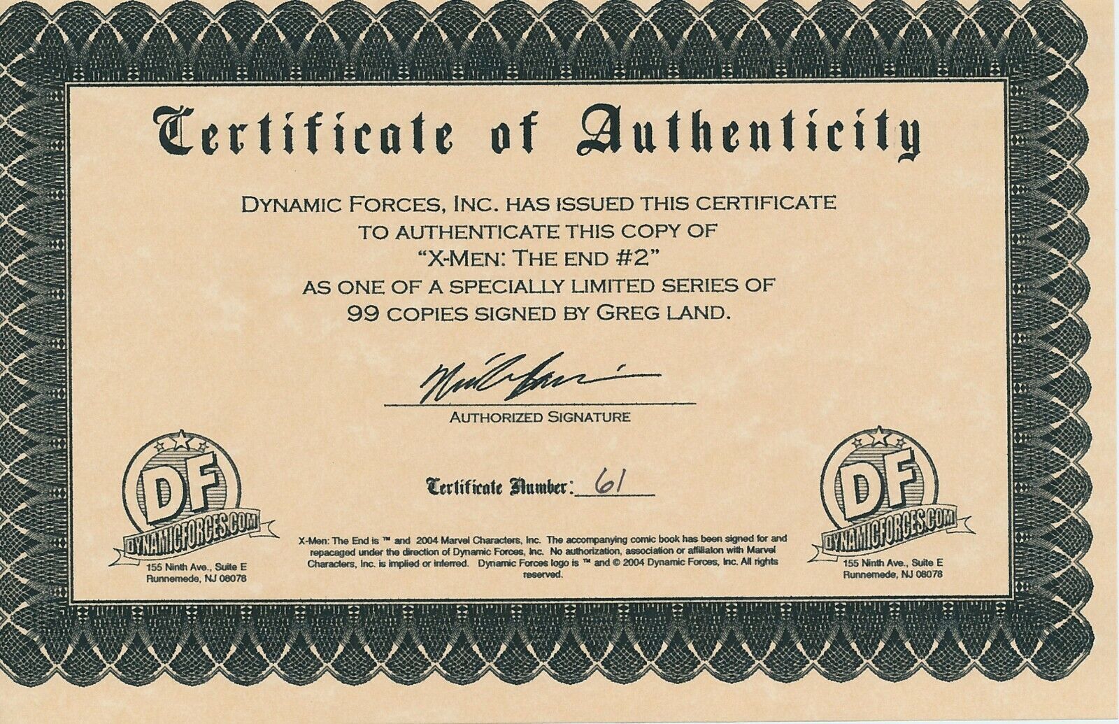 Grade: 9.2 Near Mint-Item Information: X-MEN THE END #2 SIGNED BY GREG LAND MARVEL COMICS 2004 EB204MARVEL COMICS(W) Chris Claremont (A) Sean Chen (CA) Greg Land, Matt Ryan"DREAMERS & DEMONS" Parts 1 & 2 (of 6)-It's the epic finale to the story of the Children of the Atom as renowned X-Men scribe Chris Claremont joins with star artist Sean Chen for a trilogy in the style of the Lord of the Rings movies, one that spans the length and breadth of the X-Men canon and brings the saga of Marvel's mutants to a climax!*Please note we put a generic grade of 9.2 VF/NM on all of our listings of comics but most are in better condition with very few being worse.*Certificate of Authenticity:In order to stay ahead of the collectibles market curve and offer the security and piece of mind that a mere paper COA does not and cannot provide authenticity. As always, all autographed items we sell were personally witnessed - by ourselves - being signed by the artist, writer, creator or celebrity in question or have been looked over by us and deemed authentic.Terms: We are happy to combine shipping on domestic shipments. If you purchase more than one item, and the following rate does not properly apply, please request a combined shipping invoice before making payment:First book is $4.99, each additional book adds $1.00 We DO NOT ship media mail for comics, because those shipments are legally not supposed to contain advertising and are subject to inspection. Media mail shipments also take longer to arrive, so with our First Class or Priority Mail shipment you will get your books in a timely manner and you can trust our integrity in following legal guidelines. We also take special care to package items securely, unlike others who are more concerned with expediency (and skirting shipping rules).If you are and international bidder:We use Hip's international shipping program. Information about this program and to see if you country qualifies check here: