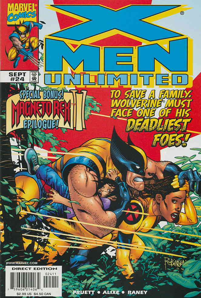 Item: X-Men Unlimited #24 | Publisher: Marvel | Cover Date: September 1999 | Writer: Joe Pruett | Artist: Pascal Alixe, Tom Raney | Cover Artist: Andrew Robinson | Appearances: Silver Samurai | Storylines: Search and Destroy; Aftermath | Notes: Wolverine story; Magneto story | With Economy shipping, each additional comic ships for just 50 cents more to customers in the USA. This listing contains a stock photo and information from ComicBase™ and © Human Computing. The stock photo is for reference only. If you would like to see a photo of the actual item, please message us prior to purchasing.Seller Information
