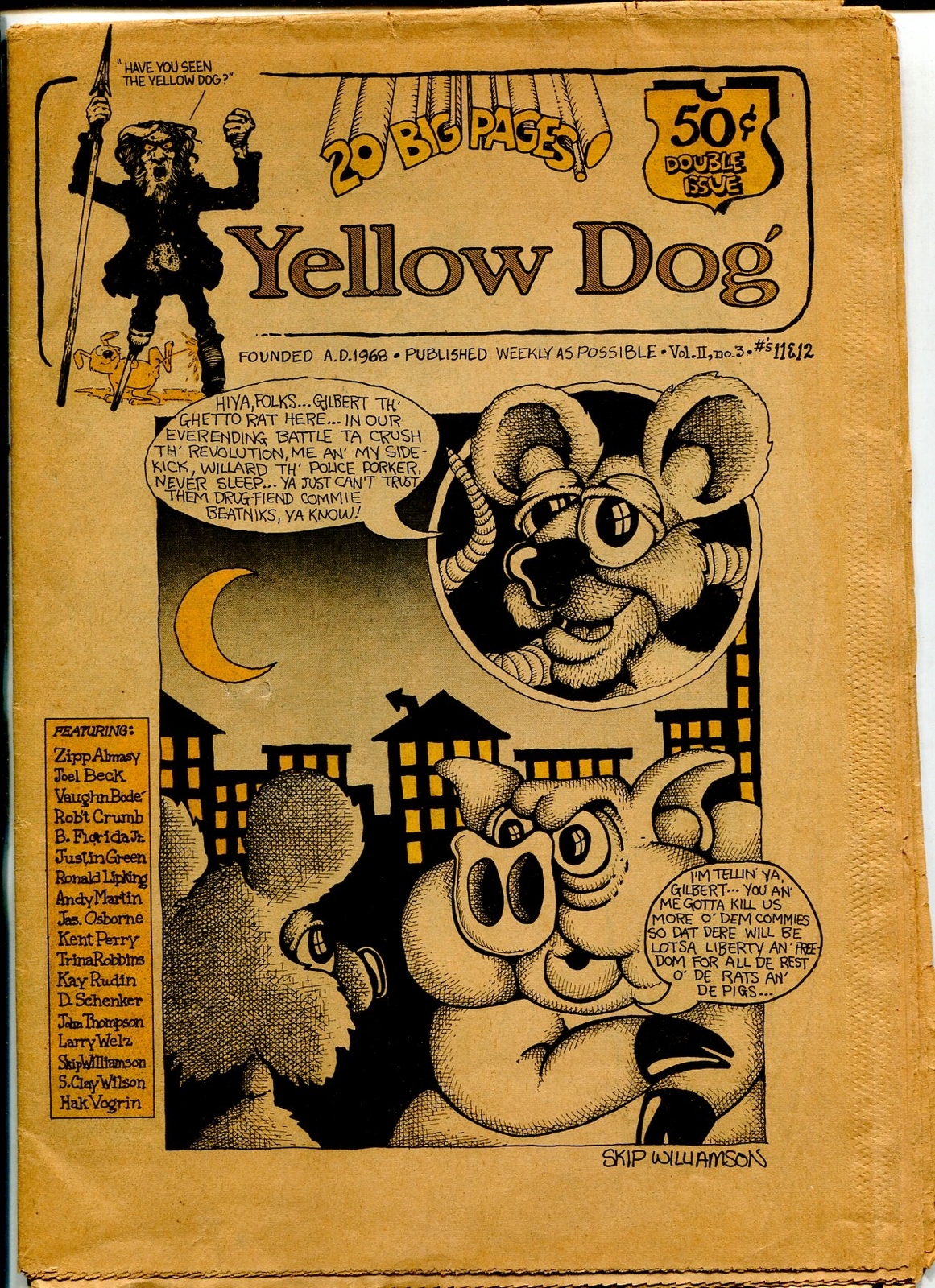 Yellow Dog #11 & #12 1968-ROBERT CRUMB-SKIP WILLIAMSON underground VG Tabloid newsprint comic with Robert Crumb, Skip Williamson, S Clay Wilson, Joel Beck, Justin Green, John Thompson and more. Double issue #11 & 12. Title: Yellow Dog #11 & #12 1968-ROBERT CRUMB-SKIP WILLIAMSON underground VG Issue: 11 & 12 Grade: VG SKU: MEN16-073Seller Information